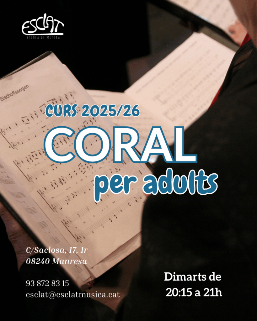 La Coral d’adults és el cor d’adults de l’esclat. Està adreçat a totes les persones a partir de 18 anys, tinguin o no coneixements musicals previs. El treball coral és una molt bona manera no només de treballar la veu, l’escolta, i multitud d’aspectes musicals, sinó de passar una bona estona envoltats de gent amb ganes de cantar.
